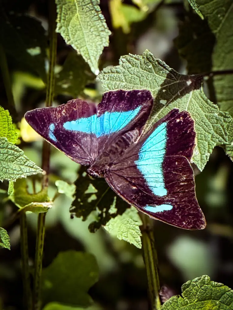 Schmetterlinge in allen Farben – der Blaue Morphofalter mit bis zu 20 Zentimetern Spannweite ist kein seltenes Erlebnis in den Bergwäldern über Miramar. Er fliegt durch Gärten und Waldränder.
