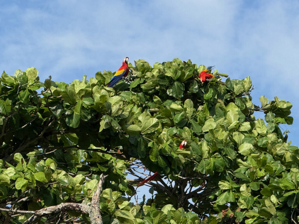 Der Carara-Nationalpark, nur etwa 30 Kilometer südlich von Velásquez Richtung Küste gelegen, ist der beste Beobachtungsort für Hellrote Aras in ganz Costa Rica. Morgens fliegen sie von den Mangrovenwäldern der Tárcoles-Mündung ins Landesinnere – und die Strecke führt direkt über unsere Region.
